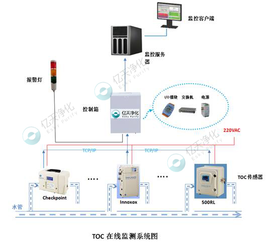 系統(tǒng)主要是由TOC傳感器、電控箱、服務(wù)器及監(jiān)測(cè)軟件組成。通過CheckPoint TOC傳感器采集數(shù)據(jù),電控系統(tǒng)傳輸數(shù)據(jù),監(jiān)控服務(wù)器負(fù)責(zé)保存處理數(shù)據(jù),達(dá)到數(shù)據(jù)實(shí)時(shí)在線監(jiān)測(cè)目的,還可以提供各種輔助功能,如:TOC歷史數(shù)據(jù)查詢、圖表生成、操作記錄、報(bào)警預(yù)警等,幫助用戶及時(shí)發(fā)現(xiàn)問題、分析問題、解決問題。