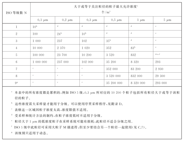 表中所有濃度都是累積濃度,例如ISO5.5 級,0.5μm 粒徑的11100 顆中,包括所有粒徑大于或等于該粒徑的粒子。