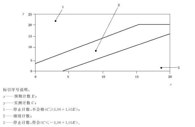 圖D.1 繪制出公式(Dl.)和公式(D.2)設定的邊界線,這兩條邊界線在限值E=20 處截止,代表采集一個完整樣本所需的時間,而C=20則為允許的最大實測計數。