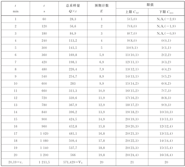 g) 如果累積實測計數保持在上限與下限之間,采樣將繼續進行,如果在規定的采樣周期內,總計數達到或小于20,并且未穿過上限,則空氣符合指定級別的限值。